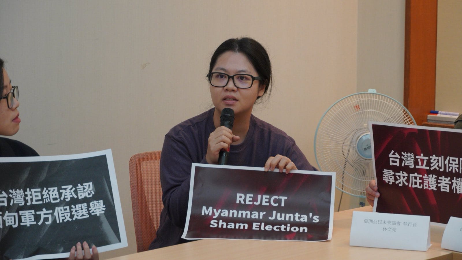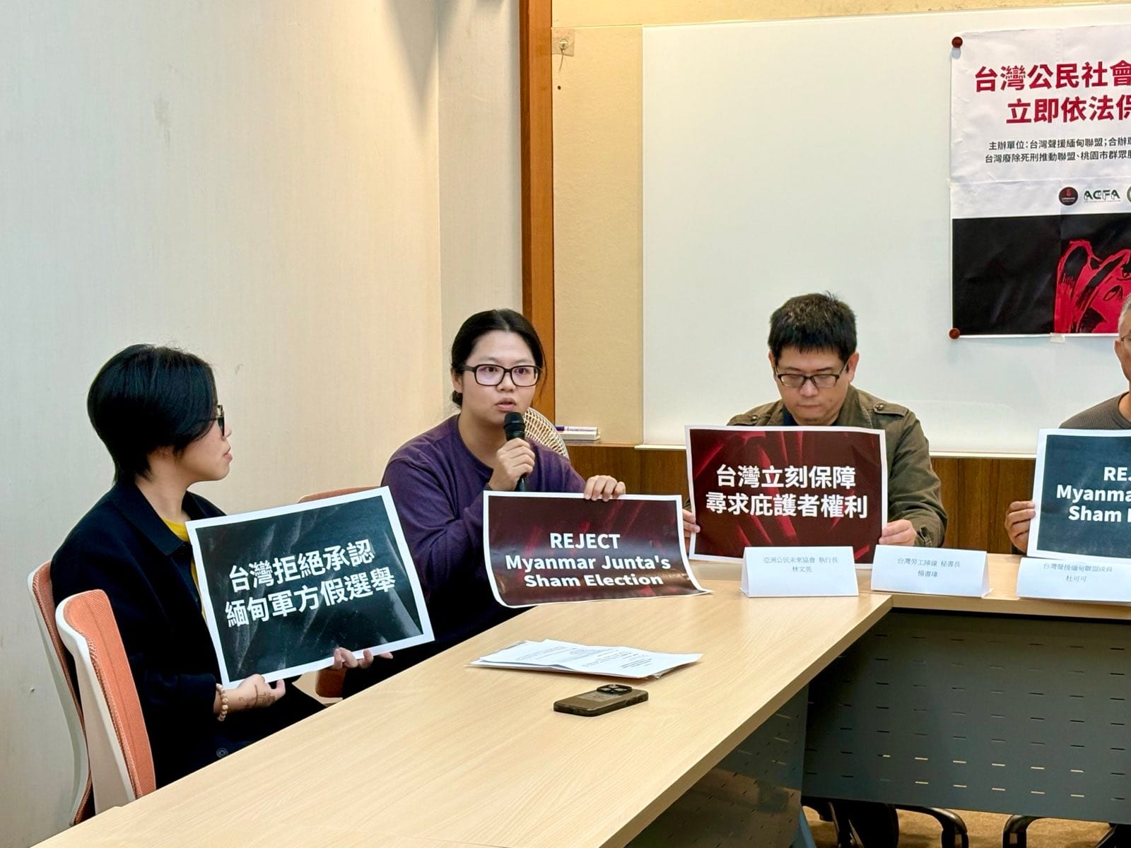 今日(2025年12月3日)所舉行之「反對緬甸軍方假選舉記者會|台灣公民社會籲政府拒認緬甸軍方假選舉!立即依法保障尋求庇護者權利!」由台灣聲援緬甸聯盟發起,並有台灣民團亞洲公民未來協會、台灣廢除死刑推動聯盟、台灣勞工陣線、台灣人權促進會等加入合辦並聲援緬甸人民抗暴,並請來國際知名的緬甸女性人權鬥士、馬格尼茨基人權獎(Magnitsky Awards)2022年得主、「緬甸反假選舉行動委員會」副主任順雷伊(Thinzar Shunlei Yi),以及馬來西亞青年人權捍衛者、國際建築工人和木工工會(Building and Wood Workers’ International, BWI)亞太區倡議專員 黃彥鉻 Wong Yan Ke連線發言,合辦團體及聲援個人喊出「戰火暴行下沒有真選舉!選舉不是獨裁政權的工具!」,要求台灣政府拒絕承認緬甸軍方假選舉,並負起人權責任,積極保障因戰亂與軍方鎮壓而被迫逃亡的緬甸人之權益。