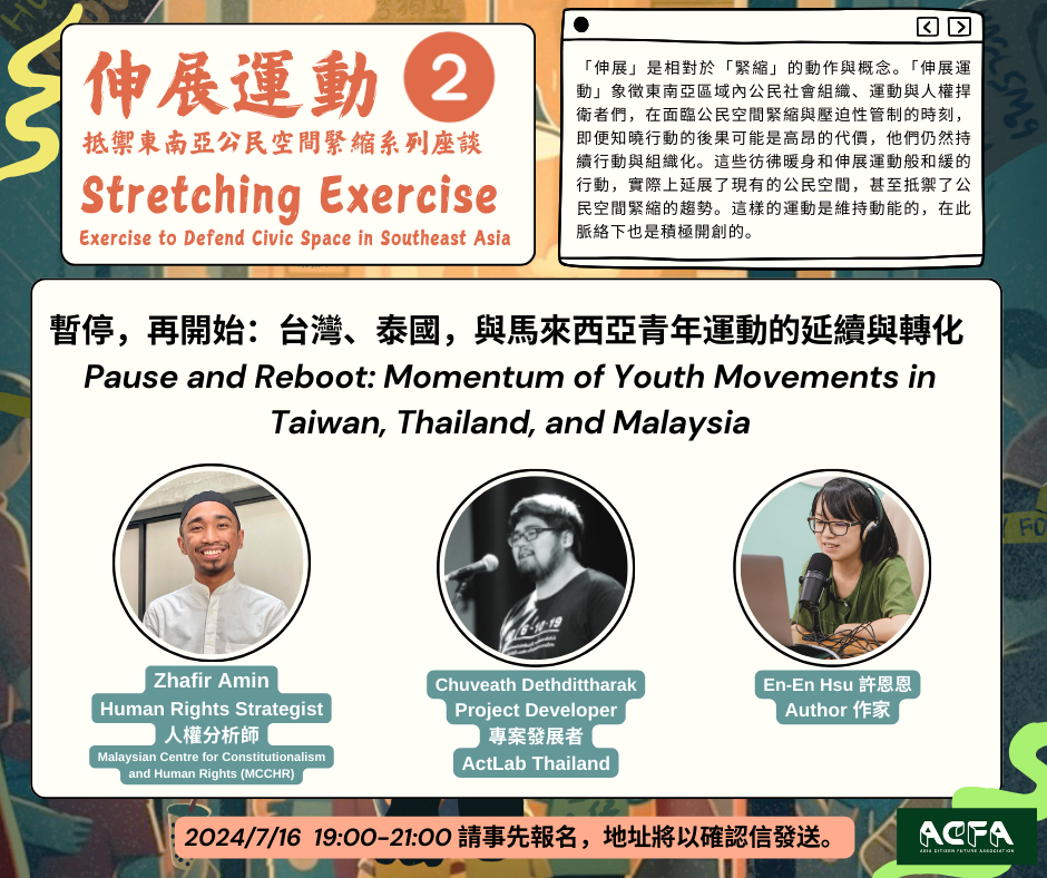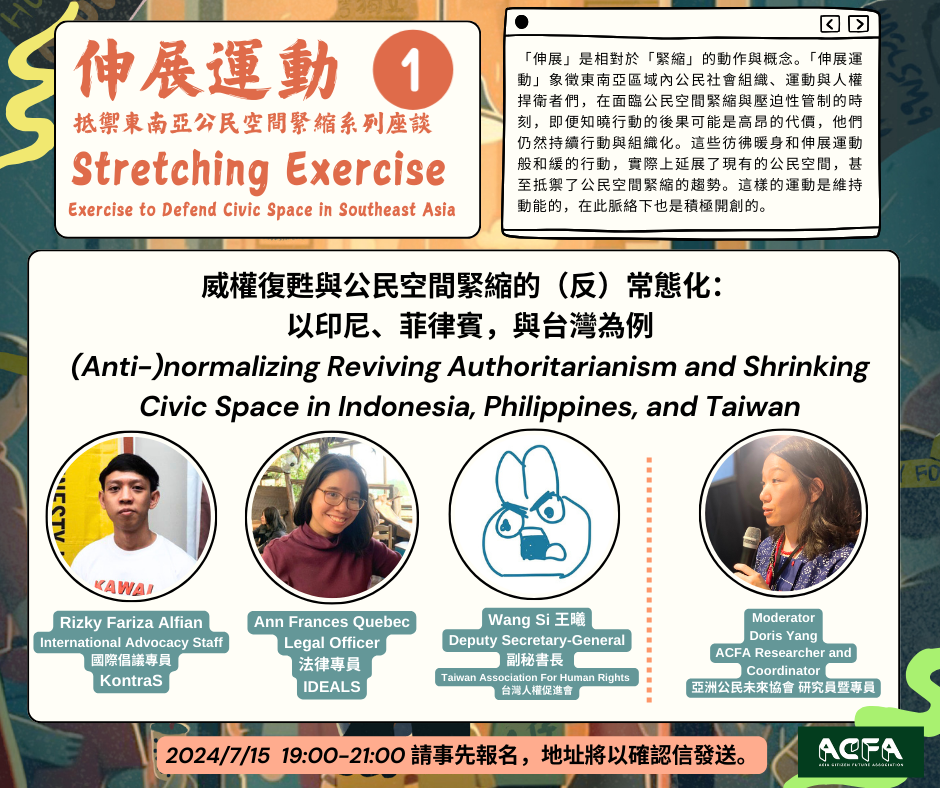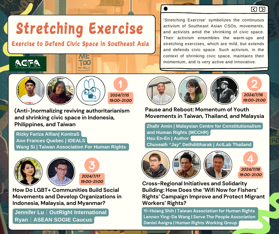 Asia Citizen Future Association (ACFA) is dedicated to connect Taiwan and Southeast Asian civil society to develop collective strategies to defend civic space. Through the four events in the series, “Stretching Exercise: Defend Civic Space in Southeast Asia”, ACFA invites more than 10 speakers from Indonesia, Philippines, Thailand, Malaysia, Taiwan, and a Southeast Asian regional organization, to discuss how organizations and activists working on various issues continue their work and push for human rights developments through local, regional, cross-regional collaborations and cross-cutting strategies.