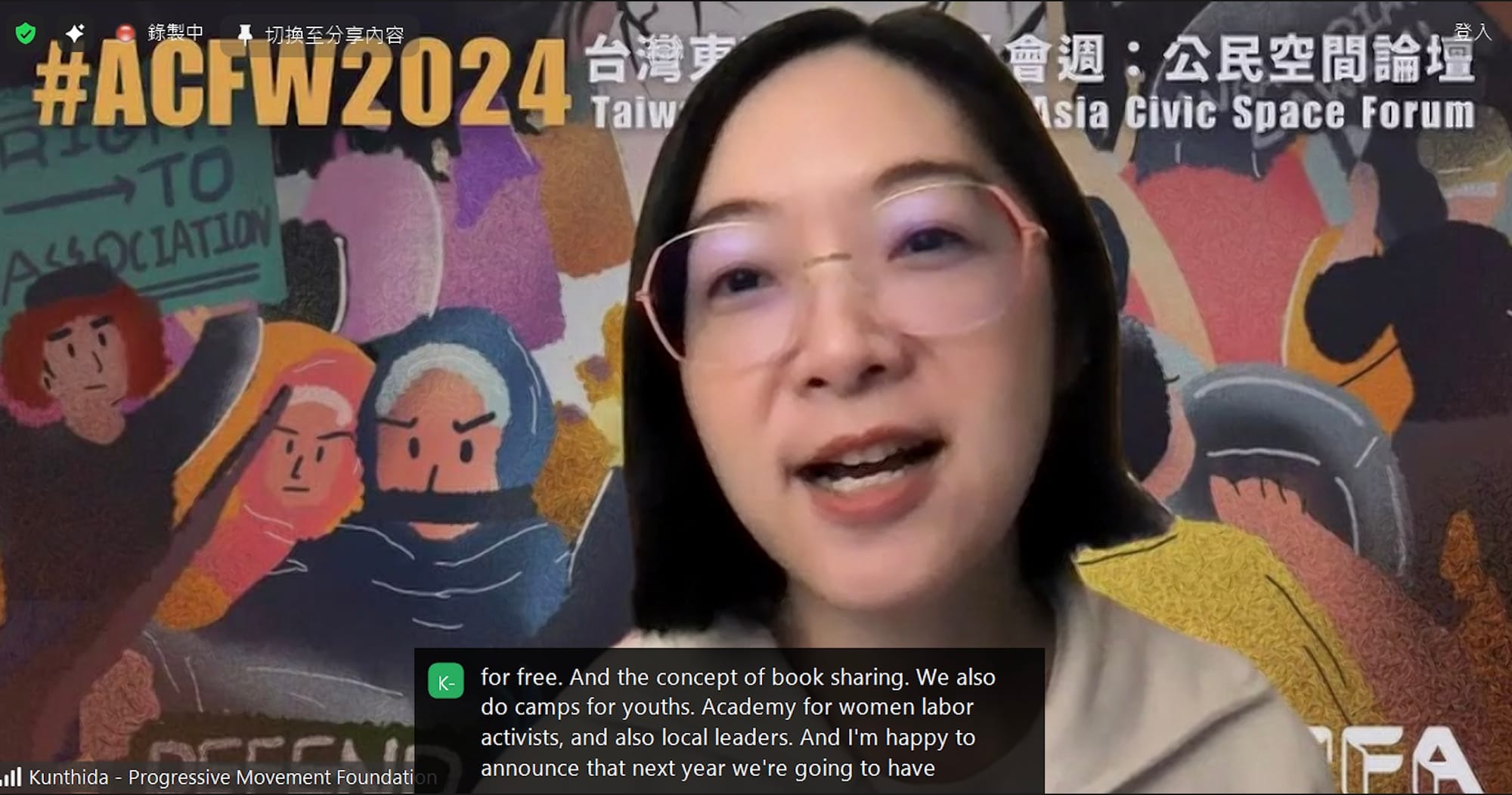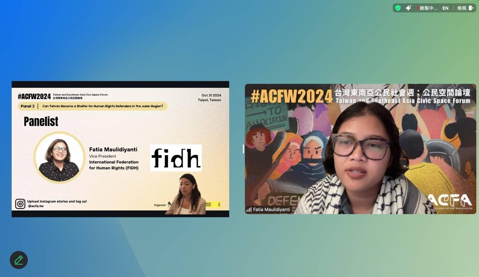 10月31日的【ACFW2024公民空間區域論壇】因應颱風則改為線上舉辦,仍吸引破百人共襄盛舉,七小時全程在線的參與者突破九成,顯示台灣公民社會對東南亞言論、集會與結社自由持續惡化的狀況十分關注。同時,再次凸顯區域、國際組織和東南亞人權團體對台灣在區域扮演人權角色的期待持續增強。