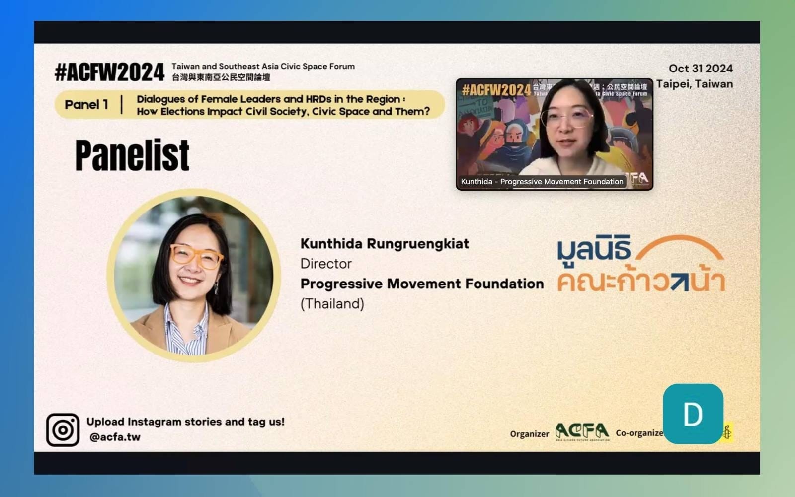 泰國未來前進黨籍前議員、現為進步運動基金會(Progressive Movement Foundation)執行長Kunthida Rungruengkiat則深入分享泰國經驗,她說:「選舉雖然看起來是對公民空間的障礙,但也是許多社會議題的催化劑。是教育公民變得更積極的機會。此外,透過公共服務滿足公民需求,一開始很難放入所有理念,我們的目標是持續與政府機構對話與監督,確保為人們提供最佳服務,例如廢棄物、水資源管理等,促進與地方連結,讓法律改革的關注也從中央擴散到地方。」