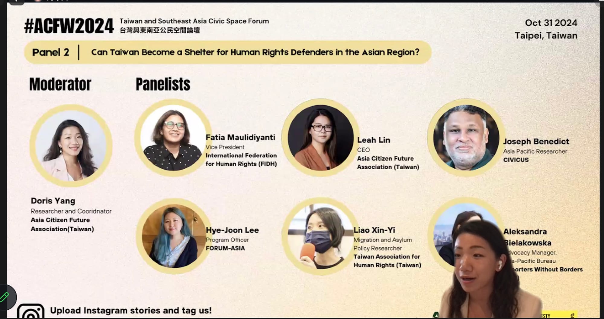 ACFW2024首日即邀請包含無國界記者台灣分會、自由之家亞洲辦事處、荷蘭海牙正義與和平中心及區域組織Forum-Asia在內的人權團體分享保護人權捍衛者的寶貴經驗。同日下午,ACFW2024東南亞人權團體代表團會見立法委員洪申翰、立法委員沈伯洋和立法委員蘇巧慧辦公室代表,表達東南亞人權捍衛者與公民社會組織對台灣提升針對東南亞人權捍衛者保護與支援的期待。