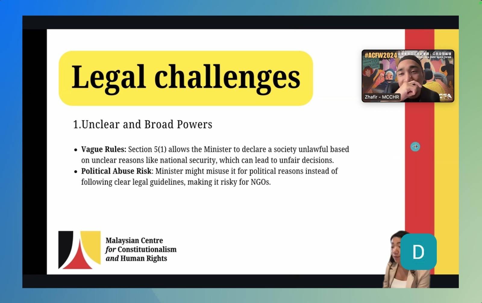 馬來西亞組織 MCCHR(Malaysian Centre for Constitutionalism and Human Rights)人權策略分析師Muhammad Zhafir Bin Aminuddin表示:「根據《1966年社團法》,組織成立法案嚴格,該法賦予政府廣泛行政權力,以定義不明的理由即可解散社團或拒絕登記新組織,存在審查標準不一致、缺乏上訴和救濟管道等問題。」