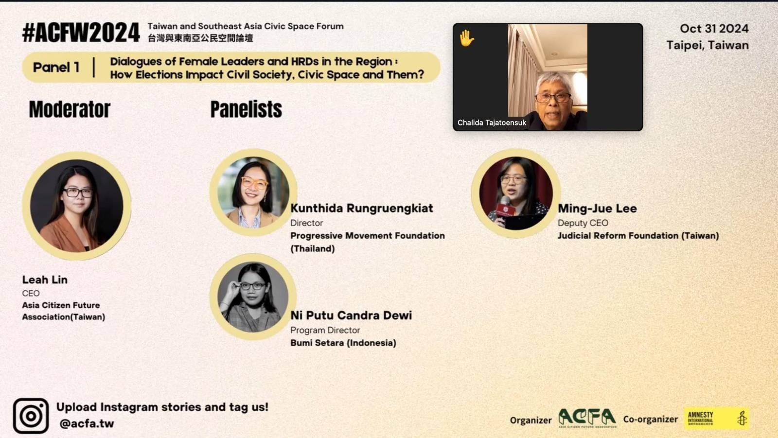印尼巴厘島Bumi Setara組織共同創辦人 Ni Putu Candra Dewi,在場次一「區域女性組織者與領袖對談:選舉如何影響公民社會與公民空間」中表示:「印尼現為寡頭政治和家族王朝政治,作為峇里人、女性、原住民,在推動身障者人權議題時,不只要看全國情況,也要看到跨國界合作的可能性,包含和東協或台灣,來發展更有創意的人權倡議策略。」