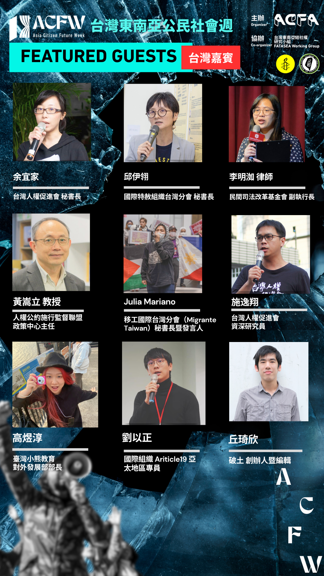 結社權是公民空間核心的一環,社運人士、勞工、學生、草根社群、女性、性少數、移民、身心障礙者、原住民及兒童等群體都受其影響。然而在現實情況中,結社自由往往難以獲得完整的保障,甚至遭受阻礙。東南亞各國的組織近年來受到日益嚴格的法律限制與監管;在台灣,公民社會組織也因當前法規不符合國際人權標準且存有管制思維,在實務面上面臨重重限制。本場次旨在呈現與探討結社自由的多元樣貌,以及在此權利受限時,不同群體所面臨的挑戰。我們不僅將辨識台灣及東南亞公民社會組織面臨的威脅與攻擊趨勢,也將了解他們如何在壓迫下運用創新策略延續行動。