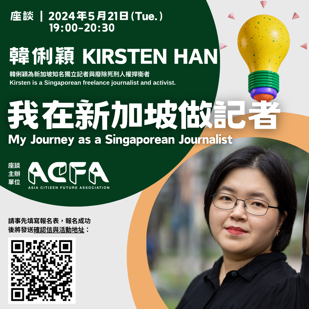 In this event, we invite Kirsten Han to share her work and experiences in independent journalism amid the challenging environment.