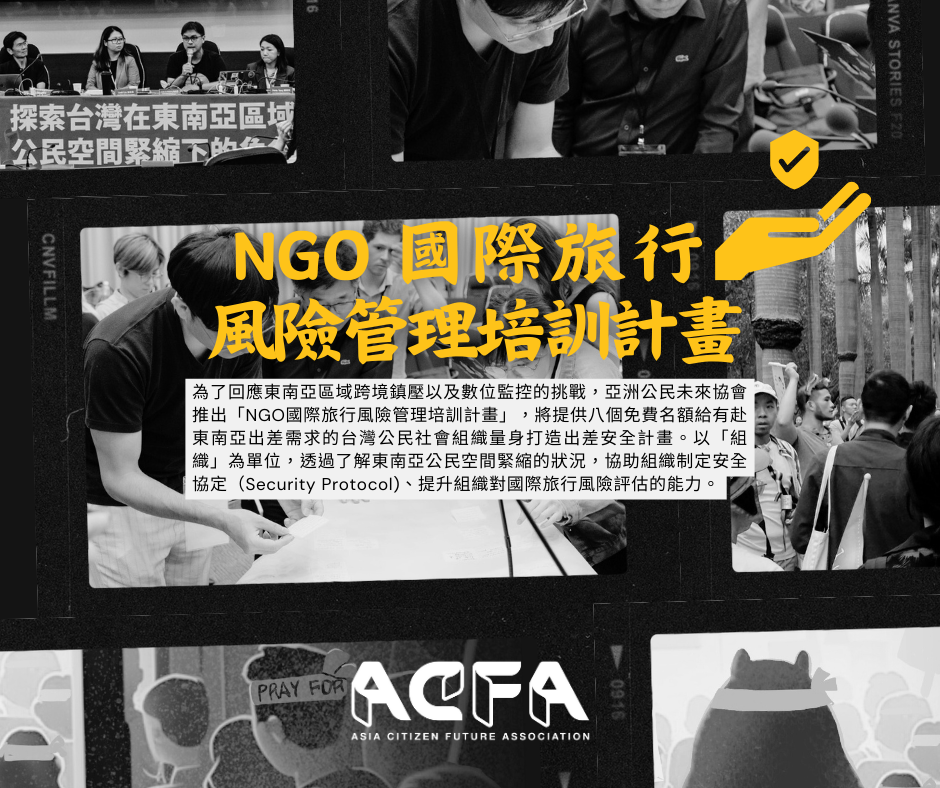 亞洲公民未來協會致力於增進台灣與東南亞公民社會交流,以共同發展抵禦公民空間緊縮的策略與能力。為了回應東南亞區域跨境鎮壓以及數位監控的挑戰,亞洲公民未來協會推出「NGO國際旅行風險管理培訓計畫」,將提供八個免費名額給有赴東南亞出差需求的台灣公民社會組織量身打造出差安全計畫。不同於以往常見以「個人」為單位的風險控管工作坊,亞洲公民未來協會將以「組織」為單位,透過本土經驗和對東南亞公民空間緊縮的狀況理解,協助台灣NGO團隊/秘書處共同制定安全協定(Security Protocol)、提升組織對國際旅行風險評估的能力,並提升台灣公民社會對東南亞人權現況的綜合理解。